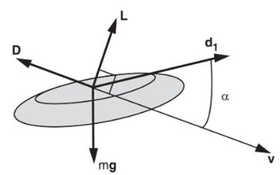 Diagram of forces on a frisbee--weight, lift, and drag--and velocity with initial flight direction